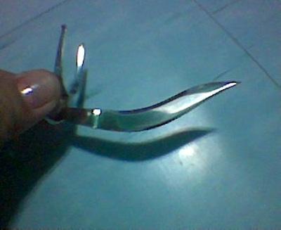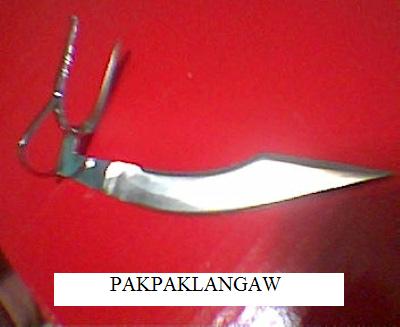here`s a picture of pakpaklangaw of augustmoon.lil bit wide longknife.this the weapon of choice for those fully aged 2 or 3 years old single stroke battlecocks with enough power in their legs.once you get hit solidly in the air and that`s it!no way to recover.we tested it many times and the one that got hit in the air with pakpaklangaw will simply go for a nosedive in the ground.the damage it incurs is so devastating the opponent could no longer stand after getting hit with this type of knife.it incurs the most damaging and biggest lacerated cavity wound compared to another longknife designs.this longknife design is not for crazy shuffling stags.pakpaklangaw design performs better on fully aged matured battlecocks,best on power single stroker deliberate hitter.it is my personal opinion that extra wide longknife is not for multipleshuffler cocks.to each his own.