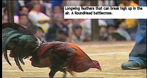 of course there are also those that have long wing feathers that can break high up in the air.if we will compare the anatomical body structure of them they usually have lesser keel muscles compared to medium breakers of roger roberts and ray alexander.here is a picture of roundhead battlecross that has longwing feathers that crushed his opponent in the air.compare to battlefowl of ray alexander and roger roberts that have long wing feathers but this one has lesser keel muscles.not solidly built but can break higher.