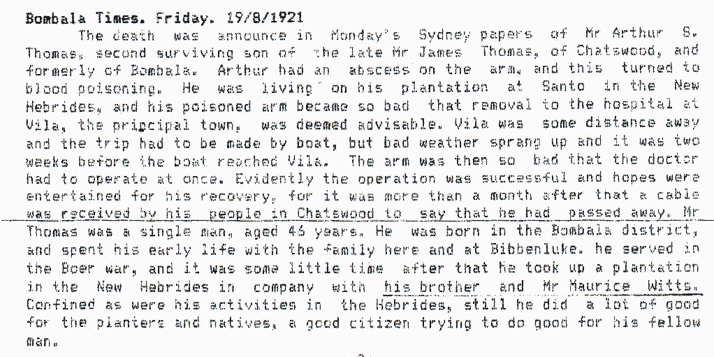 ORIGINAL DIARY HELD UNDER P.M.B MANUSCRIPT NO. 8 AT PACIFIC MANUSCRIPTS BUREAU THE RESEARCH SCHOOL OF PACIFIC STUDIES THE AUSTRALIAN NATIONAL UNIVERSITYCANBERRA A.C.T. DIARY FOR THE YEAR 1911 KEPT AT HOG HARBOUR, ESPIRITU NEW HEBRIDES BY MAURICE MYLES WITTS RESEARCH AND PHOTO COPIES OBTAINED BY HIS GREAT GRANDSON GRANT ADAM JONES TRANSCRIBED BY HIS GRANDSON PAUL LESLEY JONES WITH HELP ON THE FOLLOW UP NOTES BY HIS DAUGHTER NANCY MABEL HASSALL NOTES Word/names that could not be deciphered are represented <?> Words/names were spelling could be incorrect---- <example> ~~~~~~~~~~~~~~~~~~~~~~~~~~~~~~~ SUNDAY 1 JANUARY Commonwealth Day Hurricane yesterday. Fine again to day. J.Fysh here 20 inches rain fell during Sat. and Sunday. MONDAY 2 JANUARY Ringdore came in with top mast broken and sails blown to ribbons- also one boat missing. A.S.Thomas J.Fysh and I started to Malo 6pm. Reached Turtle Bay 12 midnight. WENDESDAY 4 JANUARY Held committee meeting during morning. Present: L Shepherd (chair) Barclay W.G.Wells J.Fysh A.S.Thomas M.M.Witts Decided to send representative (the Secretary) to Australia. Came up to Second Channel. Anchors off Michelar's. THURSDAY 5 JANUARY Stopped all day at the Second channel- old Chatinier repairing rudder. 15 ton Schooner he is making for <?> nearly finished. Spent evening up at Michelar's FRIDAY 6 JANUARY Reached Petersen's place 3pm. Stayed night. SATURDAY 7 JANUARY Took Wells up to Turtle Bay. called on Rick Hoffmann (Had lunch with him)- Persuaded us to take piano down to P. Jasons- where we again stayed the night. SUNDAY 8 JANUARY Came home found every thing well. MONDAY 9 JANUARY Planted some Corn for experiment.FRIDAY 20 JANUARY S/S Matarrbe came in this morning: No reply to report I sent in last time, re shooting affair on Boundary of my Top Blacks. That is the Gorp. all over. Meanwhile there is a general Scare here, the local natives are afraid to venture off their own garden for fear of getting shot. A Lelak woman says she saw 3 men from Thingaru's house the other day-Sepirh, Rervah, and Hagarol. Asked her not to let anyone know she had seen them. At the school they are no less frightened, while T. B's boys are panicky; watching at night and going carefully by day. So far mine are splendid and don't seem to have caught the infection. Thingaru is said to have threatened to wipe out all the white people here first, and then proceed with the natives. THURSDAY 26 JANUARY Foundation day Sent by D.S.J Letters to Nell, 2 for HBm.C, Mab 2 (2nd one containing draft for £5. Also sent Mab 1 doz. negatives to get 3 copies from each at Harringtons, also 2 Photo's. Started work to-day; 6 Middle Santo boys. Sent by D.S.J. Deeds for Depositing with Court to W.L.B. FRIDAY 27 JANUARY P.S.Thomas left for Turtle Bay to catch Steamer for Sydney. Gave him Blank Order signed myself (as treas.) on N.H.B. Association in case he should want funds. Cutting from newspaper included this page as follows Dec. 23rd. 1910 AN ISLAND SHOCK EARTHQUAKES IN NEW HEBRIDES STORES WRECKED AND MANY LAND SLIDES ----------- NATIVES ALARMED ----------- The steamer Makambo, which arrived yesterday afternoon from the New Hebrides, brings news of a severe earthquake at the island of Santo. The shock occurred on the 13th ult. and caused considerable damage Xerr's store was wrecked, also Thomas's building at Hog Harbor. The natives were greatly alarmed, fearing the worst was about to happen, but as far as could be ascertained there was no loss of life. Capt. Weatherall, of the Makambo, states that traces of the earthquake were visible all over the island. Many land slides occurred, and the mountain peaks had disappeared, the whole formation being altered. At Tasmate, on the west coast, a tidal wave occurred, lifting the beach fully three feet. The waves swept inland for some distance, and the locality was strewn with dead fish. There were thousands of dead fish lying about in all directions, said the captain. The earthquake traveled south as far as Mallicollo Island, but Santo seems to have been the center of the disturbance. no damage was reported to neighboring islands. A correspondent writes under date Espiritu Santo. November 30---"The most violent earthquake known to white residents of the New Hebrides was experienced throughout- the northern and in a less degree the southern islands of the group during the month. Though as far as I can learn there was no loss of human life. The destruction of property was considerable. Great solid houses built of masonry, some of 18 inches in thickness were thrown to the ground in a few seconds-- a shapeless heap of stones and dust. Tanks containing from a ton to a ton and a half of water were hurled from their stands, and doubled up like so many concertinas. Kitchen and other floors were deeply littered with a mass of miscellaneous debris-- once the necessary appurtenances or treasured etceteras of a household; tables walked across the room; washstands and bedsteads and chairs were doing the 'ladies chain, and for a space the world seemed to have gone mad. Bipeds were transformed into quadrupeds, and even then kept there feet with difficulty. It lasted about perhaps 30 seconds, during which time houses had been razed to the ground, crops of sweet potato had been un-earthed, cliffs had been shaken with a mighty crash into the sea tons of fish had been destroyed and even the coastline in places been altered, raising several feet higher than before."