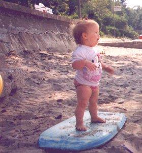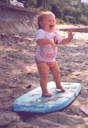 This is me "surfing" on my brothers boogie board down on the beach of Lake Erie in July 1999!
