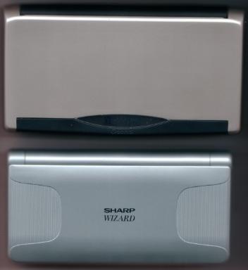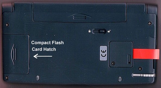 There is one way my Osaris can communicate with my PC, and that is through the compact flash card. I inserted an 8 MB CF card in the Osaris, and had no trouble typing a memo and saving it to the CF card. I put the CF card in my CF card reader, attached to my PC via USB. Then I can read, copy and edit the file on my PC, and save it back to the CF card, and put it back in the Osaris, and there it is. However, this is cumbersome, and not very useful. You can see the hatch for the CF card in the scan below: CONCLUSIONS: I cannot do a really full review of the Osaris, due to it's refusal to work with Windows ME. However, even if it did synch well with my PC, the only advantage it has over the Wizard OZ-770, in my opinion, is the additional memory capacity. For a really good in-depth review of the Osaris, follow this link. |