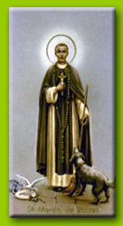 St. Martin's love was all-embracing, shown equally to humans and to animals, including vermin, and he maintained a cats and dogs hospital at his sister's house. He also possessed spiritual wisdom, demonstrated in his solving his sister's marriage problems, raising a dowry for his niece inside of three day's time, and resolving theological problems for the learned of his Order and for bishops. A close friend of St. Rose of Lima, this saintly man died on November 3, 1639 and was canonized on May 6, 1962. His feast day is November 3.