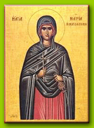 She is called "the Penitent". St. Mary was given the name 'Magdalen' because, though a Jewish girl, she lived in a Gentile town called Magdale, in northern Galilee, and her culture and manners were those of a Gentile. St. Luke records that she was a notorious sinner, and had seven devils removed from her. She was present at Our Lords' Crucifixion, and with Joanna and Mary, the mother of James and Salome, at Jesus' empty tomb. Fourteen years after Our Lord's death, St. Mary was put in a boat by the Jews without sails or oars - along with Sts. Lazarus and Martha, St. Maximin (who baptized her), St. Sidonius ("the man born blind"), her maid Sera, and the body of St. Anne, the mother of the Blessed Virgin. They were sent drifting out to sea and landed on the shores of Southern France, where St. Mary spent the rest of her life as a contemplative in a cave known as Sainte-Baume.