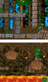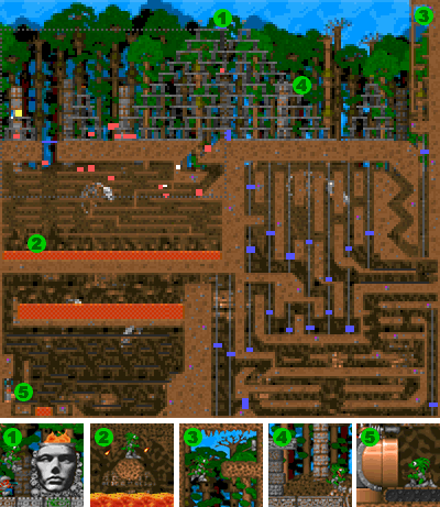 ocê deverá acionar uma alavanca que está perto das ruínas, numa subida de terra (á direita da tela). Depois de a acionar, você deve procurar uma espécie de ponte que cairá assim que Guimo pisar nela, depois de ter puxado a alavanca. Já no subsolo, sua missão agora é encontrar um par de olhos vermelhos, item que deverá ser encaixado naquela estátua em formato de cabeça no topo das ruínas. Com tudo isso feito, o único elevador que leva para a outra parte do subsolo estará finalmente autorizado para levar você até o seu destino final. Esta parte do nível necessita de um pouco mais de cuidado, pois há o grande risco de você cair em algum lago de lava e assim morrer. Você finalmente encontrará o chefe da fase ao perceber que no lugar há inúmeras esteiras rolantes, como se existisse no local uma fábrica. Exatamente! O chefe Machine é um cérebro em conserva que fabrica inimigos quando é atingido, sendo o chefe mais fácil de ser vencido ao longo do jogo. Ao destruir a máquina, a fase estará concluída.