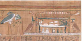 Fig. 2 Part of a vignette to Spell 17 from the nineteenth dynasty papyrus of Hunefer. Here Isis and Nephthys are depicted as kites flanking the mummy.