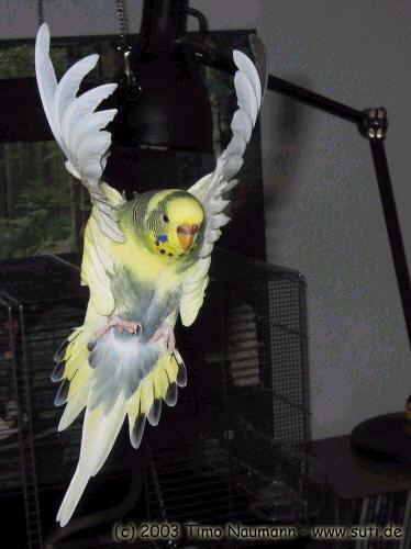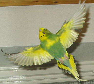¿Cuantas veces? Si la jaula no cumple con las medidas mínimas (60 x 40 para una pareja) es recomendable que siempre permanezca abierta y que los periquitos solo la utilicen como "dormitorio" por las noches. Si la jaula es más grande basta con unas horas diarias de vuelo libre (por lo menos cinco), pero cuanto más, mejor. Para poder prescindir totalmente de estas excursiones por la habitación los periquitos tendrían que vivir en una pajarera de varios metros de longitud. ¿Donde? Siempre en una habitación completamente CERRADA. Soltar un periquito a volar fuera de la casa es más que arriesgado: como aves nómadas, el sentido de la orientación del periquito no está muy desarrollado. Aunque quisiera volver, es muy probable que no encuentre el camino de vuelta a su casa. Además los periquitos tienden a huir volando de cualquier peligro que se les presente, basta con un pequeño susto fuera de la casa y el periquito sale volando "sin cabeza", sin que haya posibilidades de recuperarlo (y probablemente firmando su condena a muerte). Esto puede ocurrir también con periquitos muy mansos que en condiciones normales nunca saldrían volando de la mano. Mejor no arriesgarse. Aparte de esto, al aire libre hay multitud de peligros que no podemos evitar: plantas venenosas, contagio con enfermedades a través de pájaros silvestres, aves rapaces, el gato del vecino... Lo más normal es elegir la habitación donde poner la jaula también en función de las posibilidades que se tienen en ella de soltar a los periquitos a volar. Absolutamente desaconsejable es la cocina: hay demasiados peligros que no se pueden evitar, como vitrocerámicas calientes, vapores venenosos de productos de limpieza y teflón, alimentos inapropiados para los periquitos... Y, al no ser que te guste el potaje con plumitas, tampoco es muy higiénico. En cualquier caso, hay que preparar la habitación de tal forma que se evite cualquier peligro para los periquitos. Además conviene poner en ella algún "espacio de juegos" diseñado para los periquitos, que les pueda servir como "pista de aterrizaje" y donde puedan pasar el tiempo que pasen fuera de la jaula. El recorte de las alas