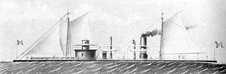 Arriba, un dibujo del "Atahualpa", antiguo USS Catawaba, partiendo de Nueva Orleans hacia el Perú, en Enero de 1869. Construido por la Compañía Alex Swift & Co and Niles Works, Cincinnati, Ohio, este monitor de clase Canonicus fue lanzado al agua el 10 de Junio de 1865. Nunca fue comisionado y fue vendido al Perú en Abril de 1868. El buque fue hundido en el Callao el 16 de Enero de 1881. Desplazamiento: 2,100 toneladas. Dimensiones: 225 x 43 x 12.5-13 pies/68.58 x 13.2 x 3.78-3.96 metros. Propulsión: maquinas Ericsson VL, 2 calderas, 1 eje, 320 caballos de fuerza, 8 nudos. Tripulación: 100 hombres. Armadura de Hierro: Bandas con blindaje de 3-5 pulgadas, cubiertas con blindaje de 1.5 pulgadas, torreta con blindaje de 10 pulgadas. Armamento: 1 torreta dual con cañones de ánima lisa Dahlgreen de 15 pulgadas. Diseñado por Ericsson, fue una versión mejorada de los blindados de clase Passaic. Diez de estos buques fueron construidos. Los cambios significativos con respecto al diseño del Passaic incluyeron un mayor blindaje, baterías principales uniformes y el reforzamiento de la armadura de la base de la torreta. Su buque gemelo, el USS Oneota, fue también vendido al Perú como el "Manco Cápac".