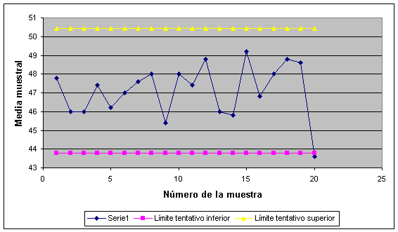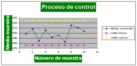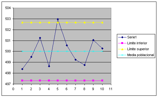 Dado que n=5, μ=500 y σ=2, los límites de control 3σ son 500±3 (2/50,5)=(497,3167; 502,5833). Nótese en la figura que la media muestral quinta está por encima del límite superior; de esta forma, durante este tiempo el proceso se juzgó como fuera de control.