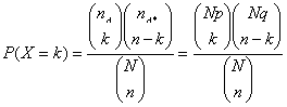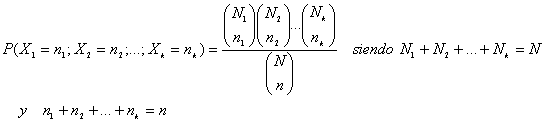 Por otra parte y de manera análoga a la distribución polinomial, si tenemos una población con N elementos repartidos en k clases excluyentes A1, A2, …, Ak con N1 elementos de la clase A1, N2 elementos de la clase A2, …, Nk elementos de la clase Ak siendo N1+N2+ …+ Nk = N, al tomar consecutivamente n elementos sin reemplazamiento y llamando Xi = “Número de elementos que hay de la clase Ai en la muestra de tamaño n” la variable k-dimensional (X1, X2, …, Xk) tiene por función de probabilidad:
