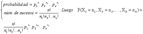Es una generalización de la distribución binomial para el caso de que en cada prueba se consideren k sucesos excluyentes A1, A2, …, Ak con probabilidades respectivas p1, p2, …, pk siendo la suma de todas igual a la unidad.