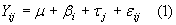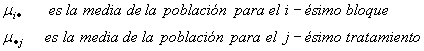 Donde i = 1, 2, …, n y j = 1, 2, …, k. e Yij es la observación de la respuesta en el i-ésimo bloque y bajo el j-ésimo tratamiento, m es la media global, bi es el efecto sobre la respuesta debido al i-ésimo bloque, tj es el efecto debido al j-ésimo tratamiento y eij es el error aleatorio. Se supone que los eij son variables aleatorias independientes y normales N (0, s2) para cualquier i, j.