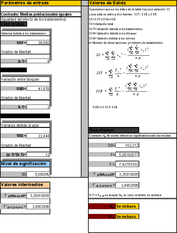 Entonces, con base en este argumento, el estadístico de prueba apropiado es el cociente de los cuadrados medios del tratamiento y del error, el cuál tiene una distribución F con k-1 y (n-1)(k-1) grados de libertad. Como antes, se sugiere una región crítica de tamaño a, ya que un valor grande del cociente tiende a indicar que no todas las medias de los tratamientos son idénticas. Debe notarse que es posible una prueba para el efecto de bloque al formar el cociente CMB y CME y compararlo con la región crítica que se encuentra en el extremo superior de la distribución F con (n-1) y (n-1)(k-1) g.l. El análisis de la varianza aparece en: