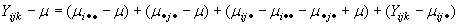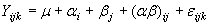 en donde Yijk es la k-ésima observación de la respuesta para el tratamiento (i, j); m es la media global, ai es ele efecto causado por el i-ésimo nivel de A, bj es el efecto causado por el j-ésimo nivel de B; y, (ab)ij es el efecto de la interacción para el i-ésimo nivel de A y el j-ésimo nivel de B y eijk es el error aleatorio en el tratamiento (i, j).