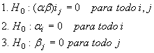 La dos últimas hipótesis incluyen los efectos (individuales) principales de los factores A y B, la primera hipótesis pertenece a la posible interacción entre A y B. Si existe una fuerte interacción entre A y B, los resultados de las pruebas para demostrar un efecto principal causado por A ó B pueden no ser significativos.