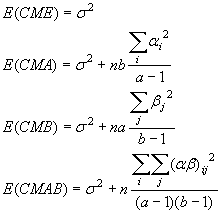 Pero si el cociente CMAB/CME tiene un valor suficientemente grande, esto sugiere una interacción estadísticamente apreciable entre A y B y, por tanto, debe rechazarse la hipótesis nula. De manera similar, si ai = 0 para toda i, CMA y CME tiene valores esperados iguales y no existe un efecto principal atribuible a A. Pero un cociente grande entre CMA y CME tiende a implicar que el efecto principal atribuible a A es estadísticamente significativo.