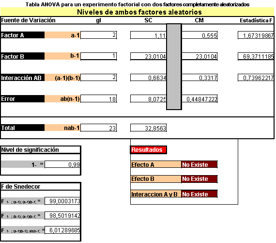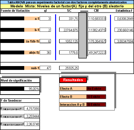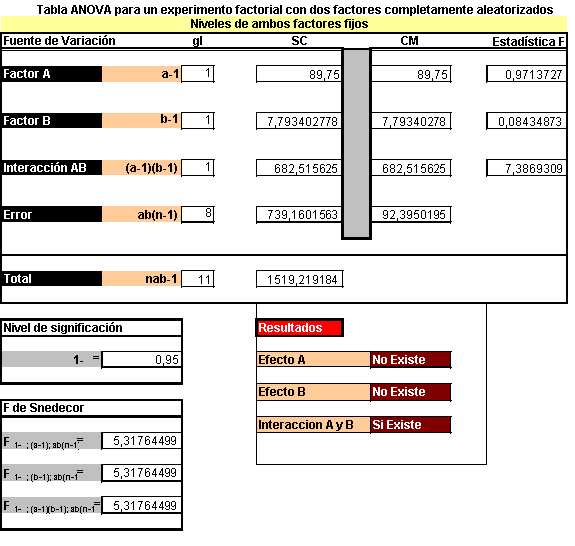 Por tanto la estadística de prueba para los efectos principales y de interacción son los cocientes entre los cuadrados medios correspondientes y el cuadrado medio del error, y tienen una distribución F.