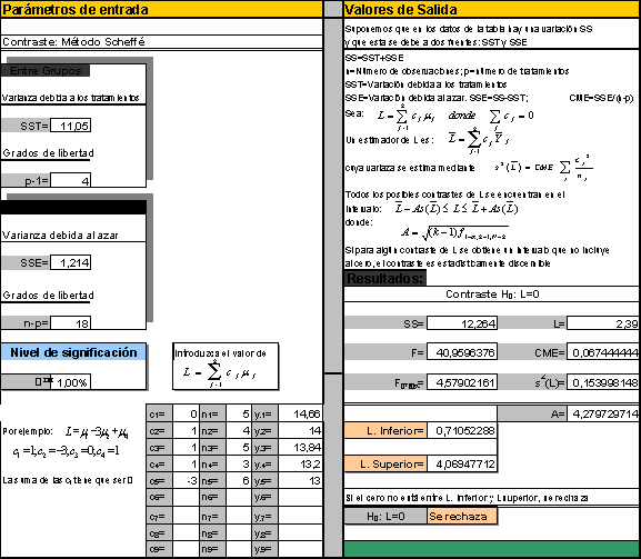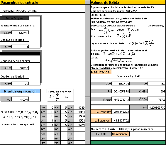 Continuando con el ejemplo, compárese m4 contra m5; m2,m3,m4 contra m5; m1 contra m2 y m3 y m4 contra m5, empleando el método Scheffé con a=0,01.