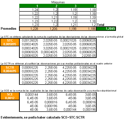 de donde st2=0,000298. Es un estimador de st2. Entonces un estimador de la varianza en el peso es s2(Yij)=0,000075+0,000298=0,00373, de la cual 000298/00373=79,89 %, se debe a diferencias entre las máquinas.