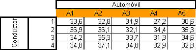La agencia de protección del medio ambiente (APMA) anualmente clasifica de acuerdo con la eficiencia en el quemado de combustible a todos los automóviles disponibles para la venta en Estados Unidos, generalmente basadas en pruebas de laboratorio. Una empresa independiente desea determinar en condiciones reales de rodamiento ( 400 millas por zonas tanto urbanas como de carretera) si existe alguna diferencia en el quemado de combustible. Para ello elige 5 automóviles que tienen la misma clasificación APMA. Los tratamientos están constituidos por los 5 automóviles, la respuesta medible es el número de de millas recorridas por galón durante las 400 millas. Pero, ¿cuál es la unidad experimental?; esta tiene que ser la persona que conduce el automóvil. No es probable que la empresa utilice un solo conductor para todo el experimento. Esto introduce un riesgo potencial que puede tomarse en cuenta mediante la creación de 4 bloques, uno para cada conductor, de tal manera que los tratamientos dentro de cada bloque ( los 5 automóviles) se apliquen a unidades experimentales homogéneas ( el mismo conductor). La pregunta que surge en este momento es como asignar los automóviles a los conductores. El diseño aleatorizado indica que la asignación debe hacerse de forma aleatoria. Para ello se concibe un método aleatorio simple, como el expuesto en la tabla: