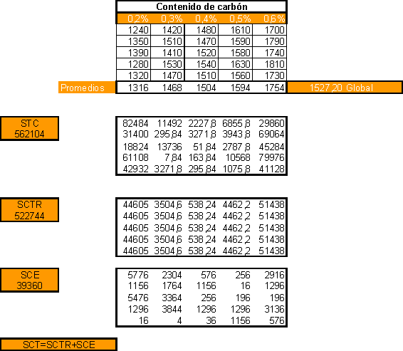 Se desea determinar si la cantidad de carbón empleado en la fabricación de acero tiene algún efecto sobre la resistencia de este. Se investigaron 5 porcentajes diferentes de carbón: 0,2; 0,3; 0,4; 0,5 y 0,6. Para cada porcentaje de carbón se seleccionaron, en forma aleatoria del mismo lote, cinco muestras de acero y se midieron las resistencias a la tensión. Se obtuvo la tabla, en donde la tensión se encuentra en kilogramos por centímetro cuadrado