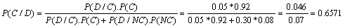P(C/D)=P(CÇD)/P(D)=0.046/0.07=0.657