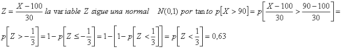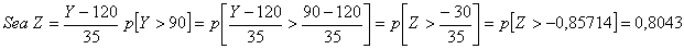 b) La probabilidad p[Y>90], se calcula de manera análoga tipificando la
