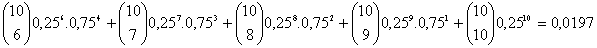 Sea X la variable aleatoria que nos da el número de éxitos en 10 pruebas. X sigue un modelo binomial de parámetros n =10 y p =0,75. La probabilidad p[X=10] =0,7510 =0,0563
