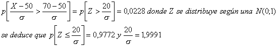 aleatoria que se distribuye normalmente con N(50; s ). Si la p[X>70]=0,0228; se deduce que