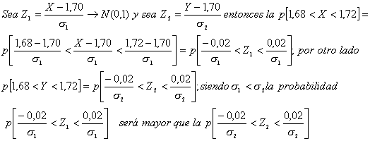 Sea X la variable aleatoria que mide la altura de los individuos de la población A y sea Y la variable que mide la altura de los individuos de la población B. X sigue una N(1,70; s1) e Y sigue una normal N(1,70; s2); con (s1<s2 ) para ver cuál de estas probabilidades es mayor: p[1,68<X<1,72] y p[1,68<Y<1,72] ; tipifiquemos ambas variables y comparemos.
