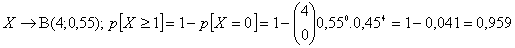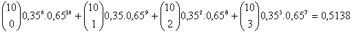 y p =0,35. La probabilidad que nos piden es p[X £ 3]=p[X=0]+p[X=1]+p[X=2]+p[X=3]=