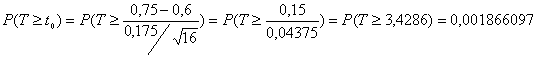 Si la media es 0,60, la probabilidad de observar un valor de T mayor o igual de 3,4286 es de 0,001866097. Valor muy pequeño que nos hace pensar que la media poblacional no es 0,60.