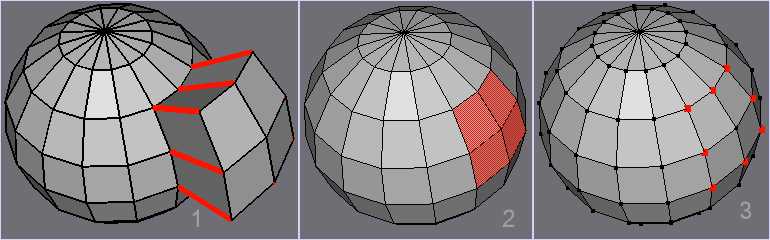 | 1 With those four faces Extrude (region)ed out some.. select anyone of the edges that were created between the face's old and new (extruded) position, and hit G(edge ring) to select them all Go to Top Menu > Select > Store Selection to temporarily store that selection.. 2 select the faces that were extruded out, and Move them back towards the mesh along the appropriate axis.. In this case the faces were extruded out with Extrude Region > Normal, so I'll move them back with Move > Normal Zoom in to see clearly, and match the faces with their old pre-extrusion position as much as possible 3 if you've matched it up well enough, you can switch to Body/Object mode and do a Right Click > Cleanup, but if that doesn't work.. Go back to the top menu and re-select those (now tiny) edges.. Top Menu > Select > Recall Selection, then simply Right Click > Collapse to get rid of them |
