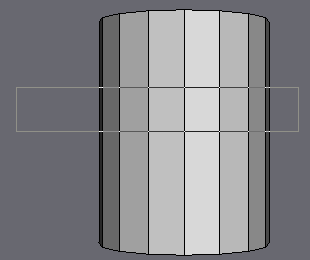 | [3] Once upon a time, Wings kinda forced you to UV map everything in one go.. if I remember it right anyways. In any case, that's not how it must be done now, and we're gonna do the side faces only at first, then do the top and bottom ones later. So, hit Space to clear the selection, then hit X or Z to view the cylinder from the side and drag a selection box over the central faces like so (left click on nothing and hold&drag to start a selection box) to select all the side faces.. | ||||||||||||||||||||||||||||||||||||||||||||||