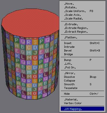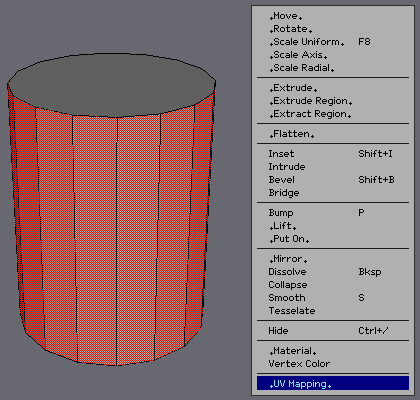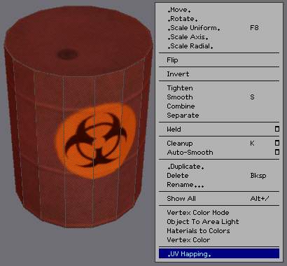 | [12] As you can see the texture's been applied to the barrel already, but we still have to adjust it's layout some.. so select the whole object in Body mode and Right Click > UV Mapping | ||||||||||||||||||||||||||||||||||||||||||||||