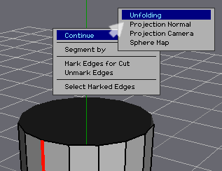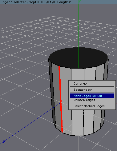 | [5] in some cases the edge you select will matter, in this one it really doesn't.. I'm gonna select the one facing towards the Z axis.. but any one of the vertical edges should do fine. So select one, and Right Click > Mark Edges for Cut. That's gonna be where the closed surface gets chopped so that it can be spread out flat. | ||||||||||||||||||||||||||||||||||||||||||||||