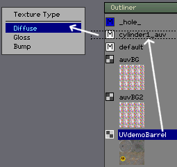 | [11] Now open the Outliner (Top Menu > Window > Outliner) and you'll see the image there near the bottom.. Will also see the barrel's material there (little [M] icon next to it), should be labeled "Cylinder1_auv" by default. Click on the name of the image ("UVdemoBarrel", with the little checkerboard pattern icon next to it) and Drag & Drop it onto the name of the material (Cylinder1_auv). A little "Texture Type" window will pop-up, choose Diffuse. | ||||||||||||||||||||||||||||||||||||||||||||||