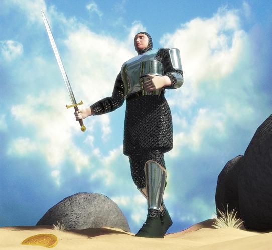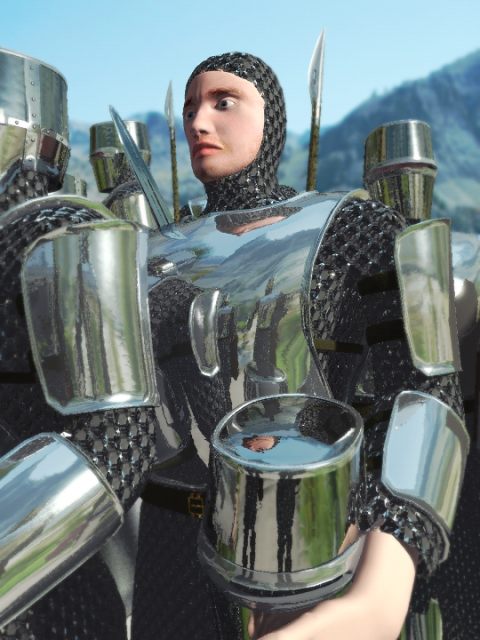 | 'The tunic' is how it all started, just a way to demonstrate Wings 3D's new (at the time) smooth proxy mode to someone. But I went with it, and kept adding on to the figure. At first just adding legs and finishing the body. Later even adding some straps and armor. The head and the helmet weren't modeled for this figure, and are both recycled from older projects. They were both originaly modeled in Nendo, later getting significantly reworked and improved with Wings. The face was 'extract regioned' off of this older head, and only the part that's visible is actualy there. (back of the head, ears etc are all chopped off). The texture on the face is only experimental (that was also made before, and not while doing this 'knight').. It was a test in using photo sources for textures. A pretty sucessfull experiment, but the texture could be better and is pretty blurry in some areas.. (Though that's only noticible in close-up renders, which I didn't include here. :P ) |