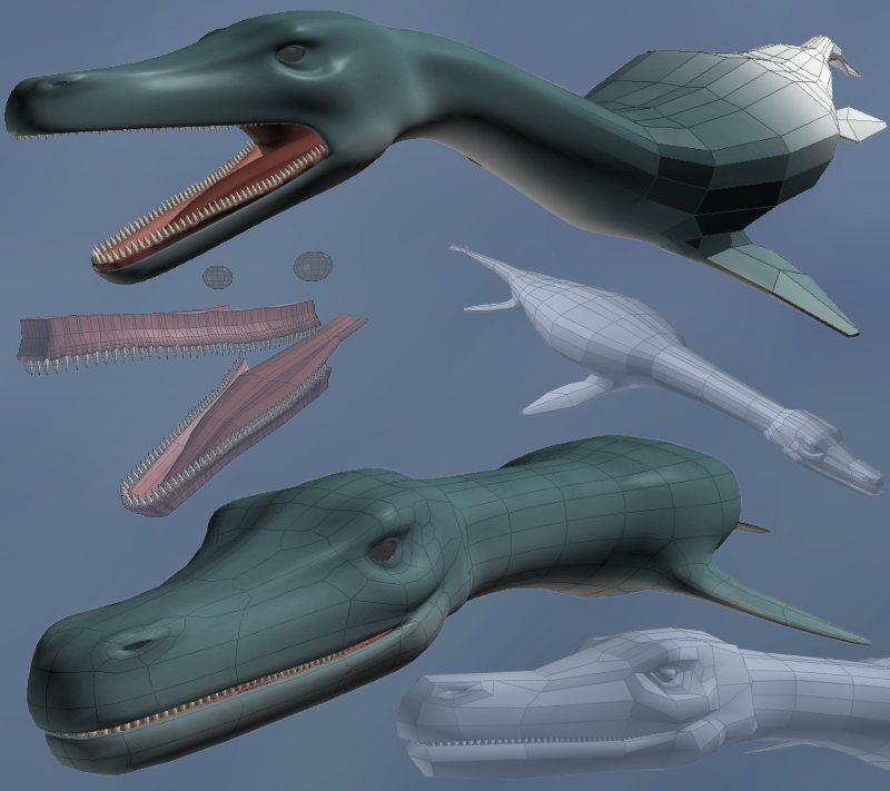 | Ray Dream 5.5 rendering Painter 5.5 extra 2D tweaking (mostly just brightness / contrast ) Had some problems with textures, so this version isn't using them (except the inside of the mouth). just procedural stuff. still trying out some different eyes, but think I'll leave 'em black and shark-like as they are now.. |