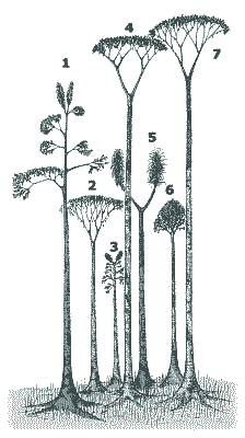 1883 sketch of upright Lycopod trees, Carboniferous 'Fossil Grove' Victoria Park, Glasgow. From Transactions of the Geological Society of Glasgow. 8, 227-235.
