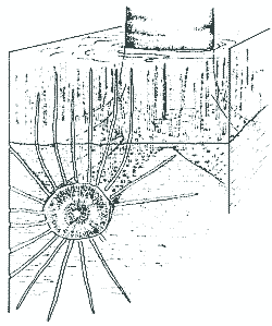 The organs of the plant generally accepted as the subterranean parts of these lycopods are cruciform in shape with four dichotomizing stigmarian axes radiating from the base (Williamson, 1887). Stigmarian axes departed the base of the tree (positive geotropism) at varied angles (see: Potonie, 1920; Frankenburg and Eggert, 1969), dichotomized twice, and bore helically arranged lateral appendages sometimes referred to as stigmarian 'rootlets' (Charlton and Watson, 1982). 'Rootlets' attained a maxium diameter of 1 cm, and were deciduous at least near the base of the tree (Frankenburg and Eggert, 1969)."
