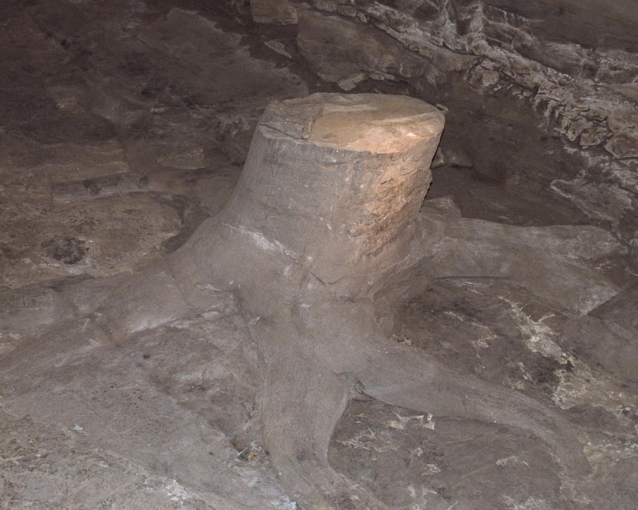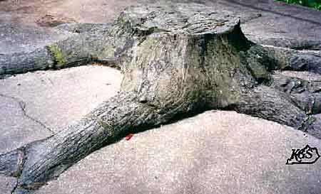 " . . . the stigmarian axes interlace in a complex manner and demonstrate that the axes spread out over an immense aerial, three-dimensional surface. Williamson (1887) figured a stump with stigmarian axes which were distributed over an 926 square foot area, and recorded the discovery of a single stigmarian axis of 37 feet 4 inches in length. The stumps which are attached to such systems cross cut the encasing lithology(ies) and are commonly abruptly terminated in the upper sediments. The heights to which trunks are preserved may be minimal or may be in excess of 6 m (i.e. Teichmuller, 1955; Pontonid, 1920). The distribution of large numbers of erect trunks conform to natural spacings (DiMichele and DeMaris, 1982; Gastaldo, 1983)."