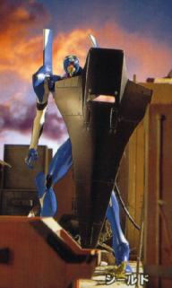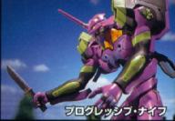 Progressive Knife or Prog-Knife. This is a vibrating blade made up of a special alloy which makes the blade very sharp. This the most common weapon used by the Evangelion and this is located in the shafts above the arms. EVA02 uses a new cutter-type knife -- even if the blade is broken, a new blade will come out from the back by pushing a button, making the knife useable again. | |