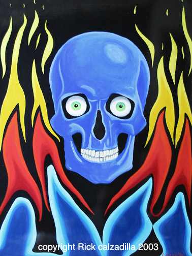 This is an abstract painting of a skull which is to say , it is a less than realistic rendering by Rick Calzadilla