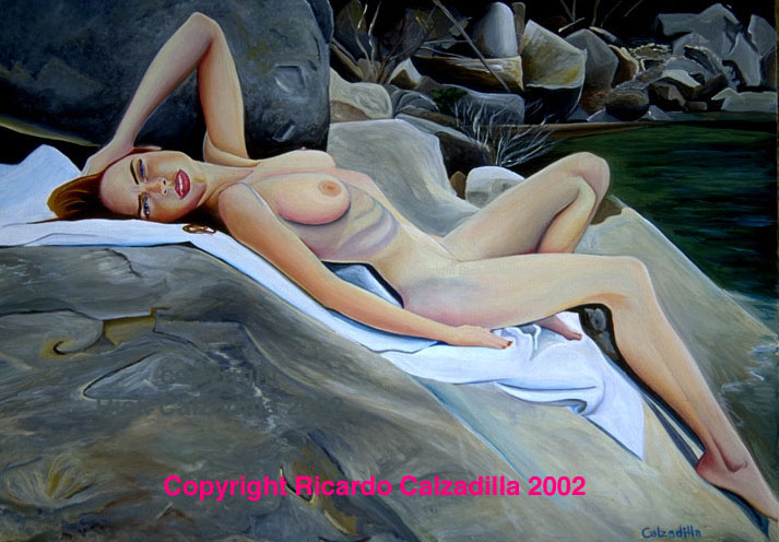 Fine Art paintings Rick Calzadilla Austin,Texas. Lide Nude Figure Paintings. "Nude on Rocks" Contact 512 567 3361