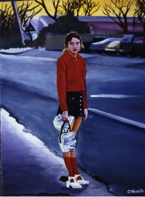 "Red Sweater Girl" painting of a random girl in Hyde Park Austin, Texas by Rick calzadilla
