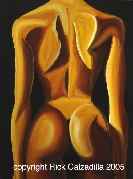 Fine Art paintings Rick Calzadilla Austin,Texas. Life Nude Figure Paintings. "Torso Brown Rear" Contact 512 567 3361