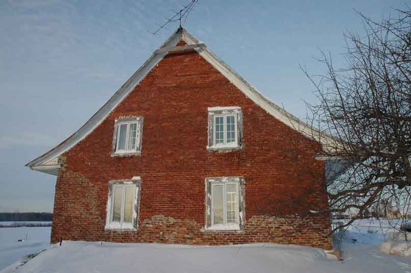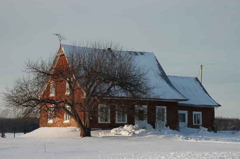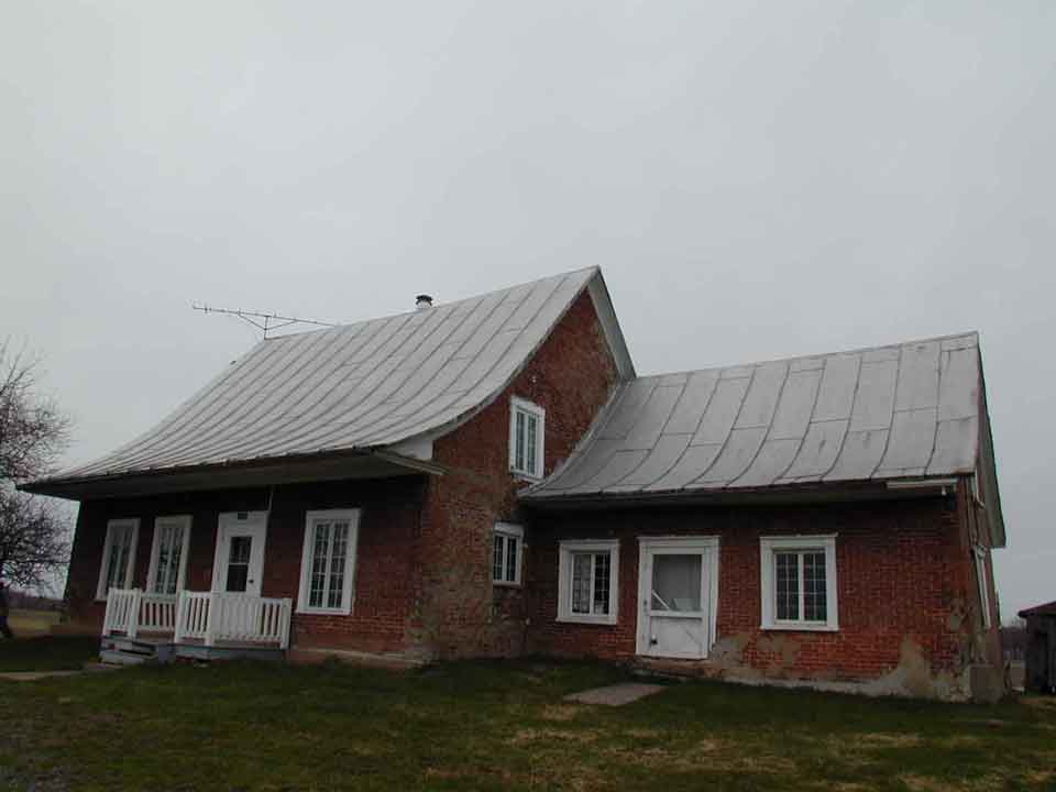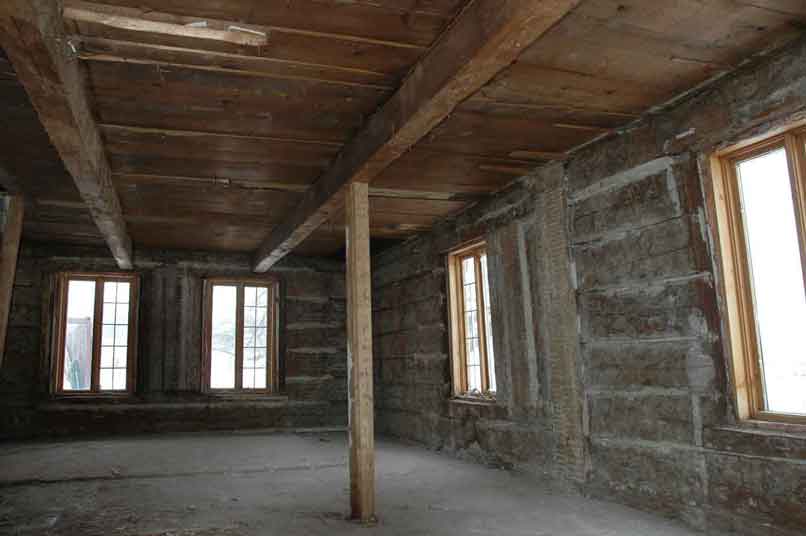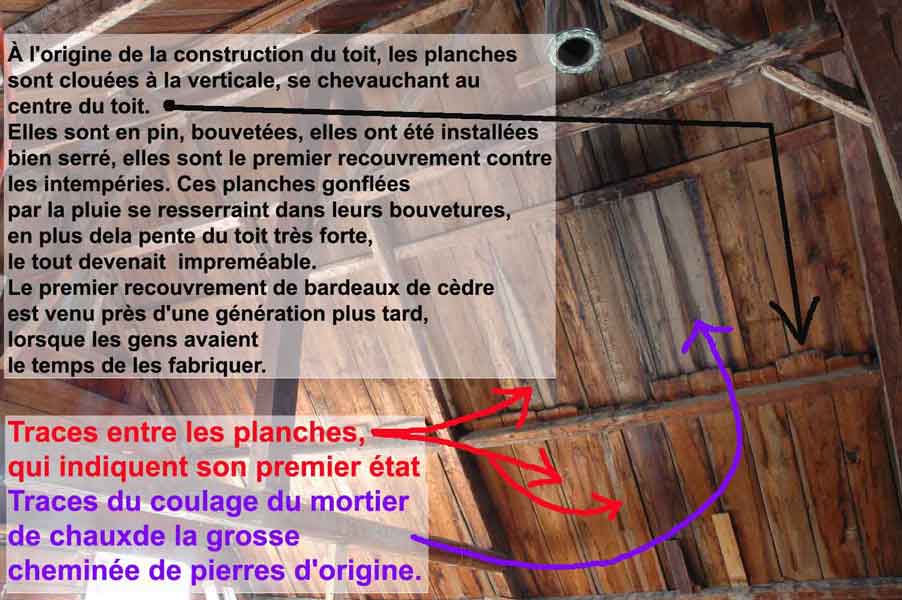 Le carr� de la grande maison est pi�ce sur pi�ce, assemblage � queues d�aronde dans les coins. Les pi�ces de pruche ou d��pinette constituant les murs sont de tr�s gros volume, typique des premiers arbres gigantesques des for�ts vierges d�il y a +/- 250 ans de cette r�gion. Le recouvrement des murs de la grande maison, � l�int�rieur, �tait en cr�pi sur lattes, cr�pi install� au milieu du 19i�me en m�me temps qu�on y a ajout� la brique sur les murs ext�rieurs et le plafond � caisson, �galement en m�me temps qu�on a transform� le toit en lui donnant sa forme actuelle de maison � la Qu�b�coise et en m�me temps qu�on a construit la cuisine d��t� juxtapos� � la maison, tel qu�on le voit actuellement. On �tait � cette �poque en pleine mode Victorienne et c��tait la mode de ce temps-l� de rendre les anciennes maisons Fran�aises � toit � pente raide, en Qu�b�coise. D�s que ce toit galb� � la Qu�b�coise sera curet� de l�ext�rieur, on va revoir la forme de la premi�re maison d�origine. � suivre �