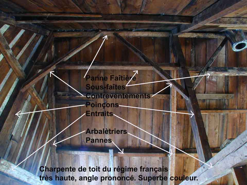 Structure de la grande maison provenant de la fin du r�gime fran�ais, avec charpente de toit d�influence fran�aise, charpente style Percheron. Charpente absolument magnifique, les pi�ces de bois de la charpente sont d�une belle couleur vieillie, massives, �quarries � la hache de main de ma�tre, construction selon les influences du r�gime Fran�ais. Les assemblages entre les diff�rentes poutres du toit sont de charpenterie haut de gamme.