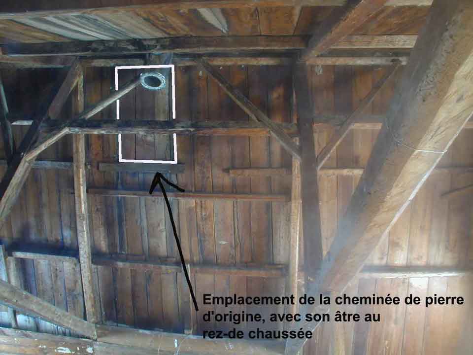 � cette premi�re �poque Fran�aise de la maison, le po�le en fonte (cuisini�re) n��tant pas encore sur le march�, la cuisine et le chauffage de cette maison suit la tradition Fran�aise, c�est � dire une chemin�e de pierre avec �tre au centre-Est de la maison. La chemin�e de ma�onnerie n�existe plus mais les cicatrices dans les planchers et toit de la maison, t�moignent de cette �poque d�origine de la maison. Le futur curetage ext�rieur des murs de briques, nous en dira plus long sur cette premi�re �poque Fran�aise du v�cu de la maison.
