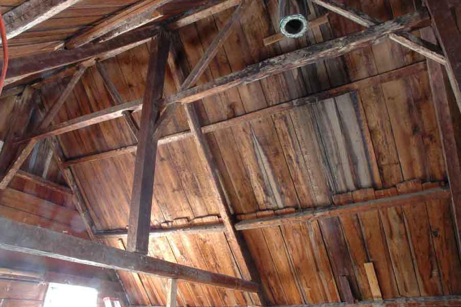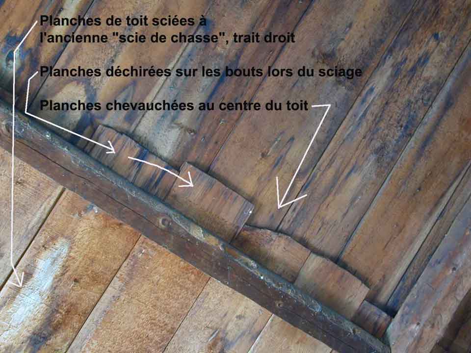 Les planches de toit et des pignons sont tr�s larges, sci�s � scie de chasse �, d�une belle couleur vieillie rouge fonc�es typique de grenier. Elles semblent au premier examen intact � plus de 95 % au toit, pour les pignons peut-�tre � 50%.